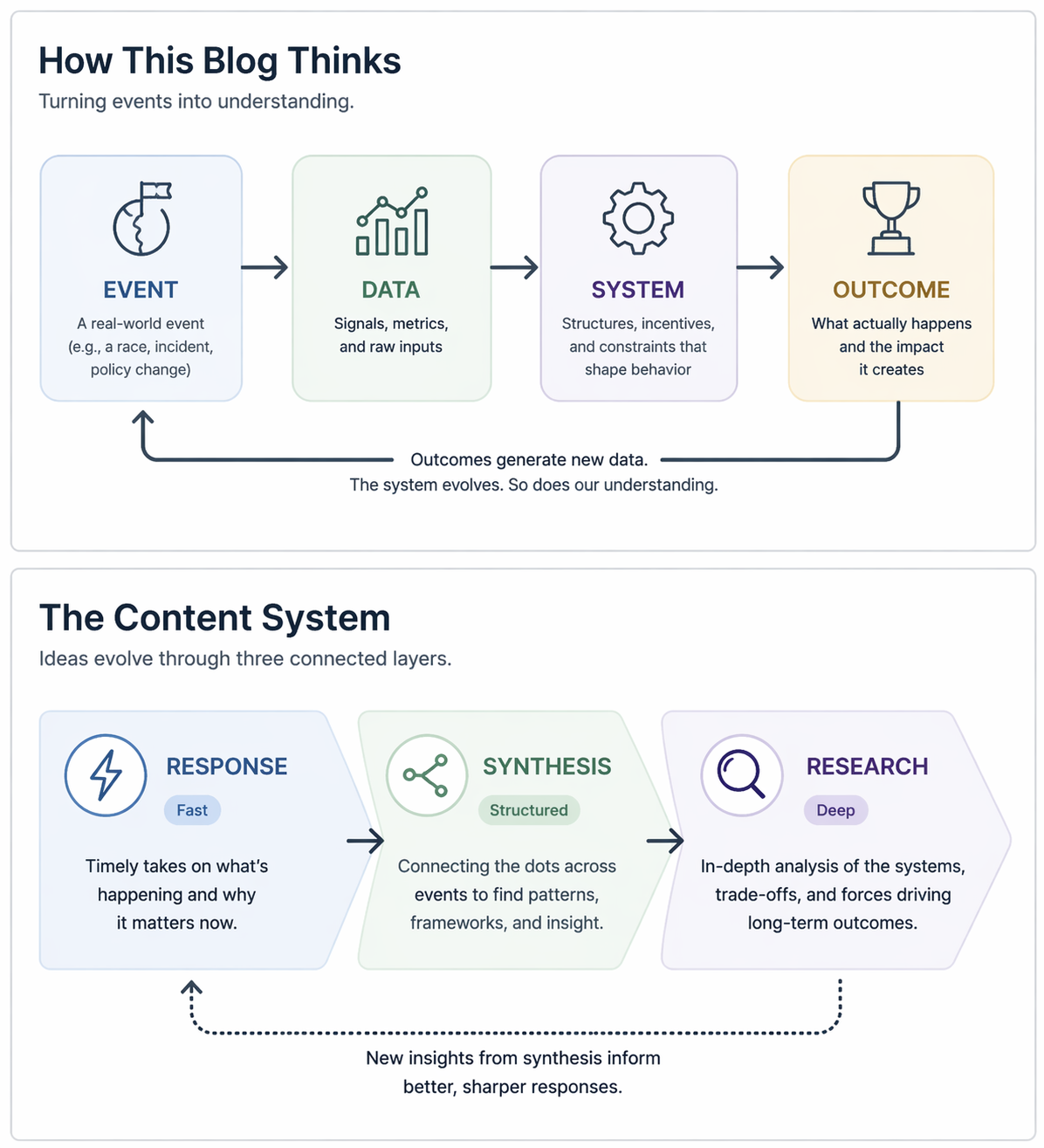 Some articles respond directly to current events (think: Formula 1 races, advances in AI/ML, cybersecurity incidents, and major news stories). Others step back and connect patterns across multiple events to help readers like you develop clearer ways of thinking. This is neither a news site, nor a traditional research journalI chojen. It is a place to think through what's happening, why it matters, and the role of data.